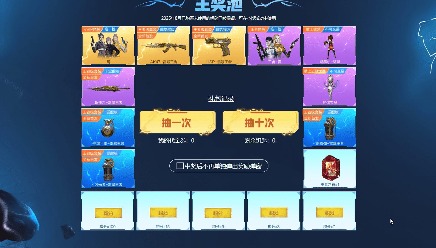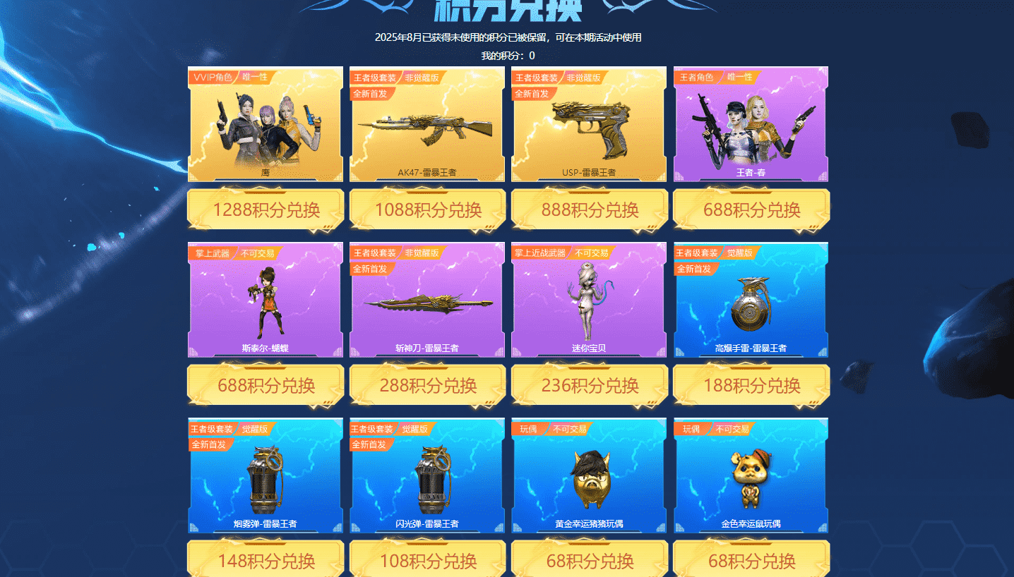 全新首发雷暴王者套装包含:鹰、AK47-雷暴王者、USP雷暴王者、王者-春、斯泰尔-蝴蝶、斩神刀-雷暴王者、迷你宝贝、高爆手雷-雷暴王者、烟雾弹-雷暴王者、闪光弹-雷暴王者、王者之石x1