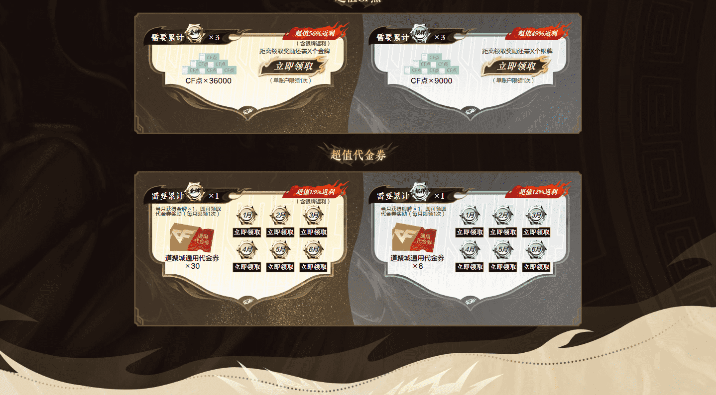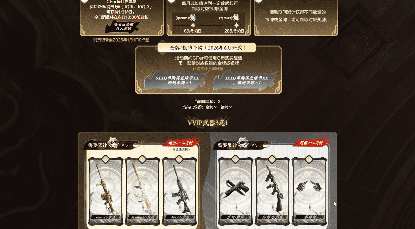 白虎超值返利 作者:子晨 · 2026年02月07日 · 15 次浏览 活动时间:2026-01-01 至 2026-07-01 白虎超值返利:CFer每月在游戏实际充值/消费1元(1Q币、10Q点)可获得1成长值。今日消费将在次日10:00前刷新 ⏰ CF活动汇总提醒:本活动还有 -- 结束 武器 · 皮肤 Barrett-朱雀 M4A1-青龙 Scar Light-白虎 沙鹰-修罗 麒麟刺 汤姆逊-烈龙 ← 上一个活动 雷暴王者 全新首发 下一个活动 → 神功天巧 套装返厂