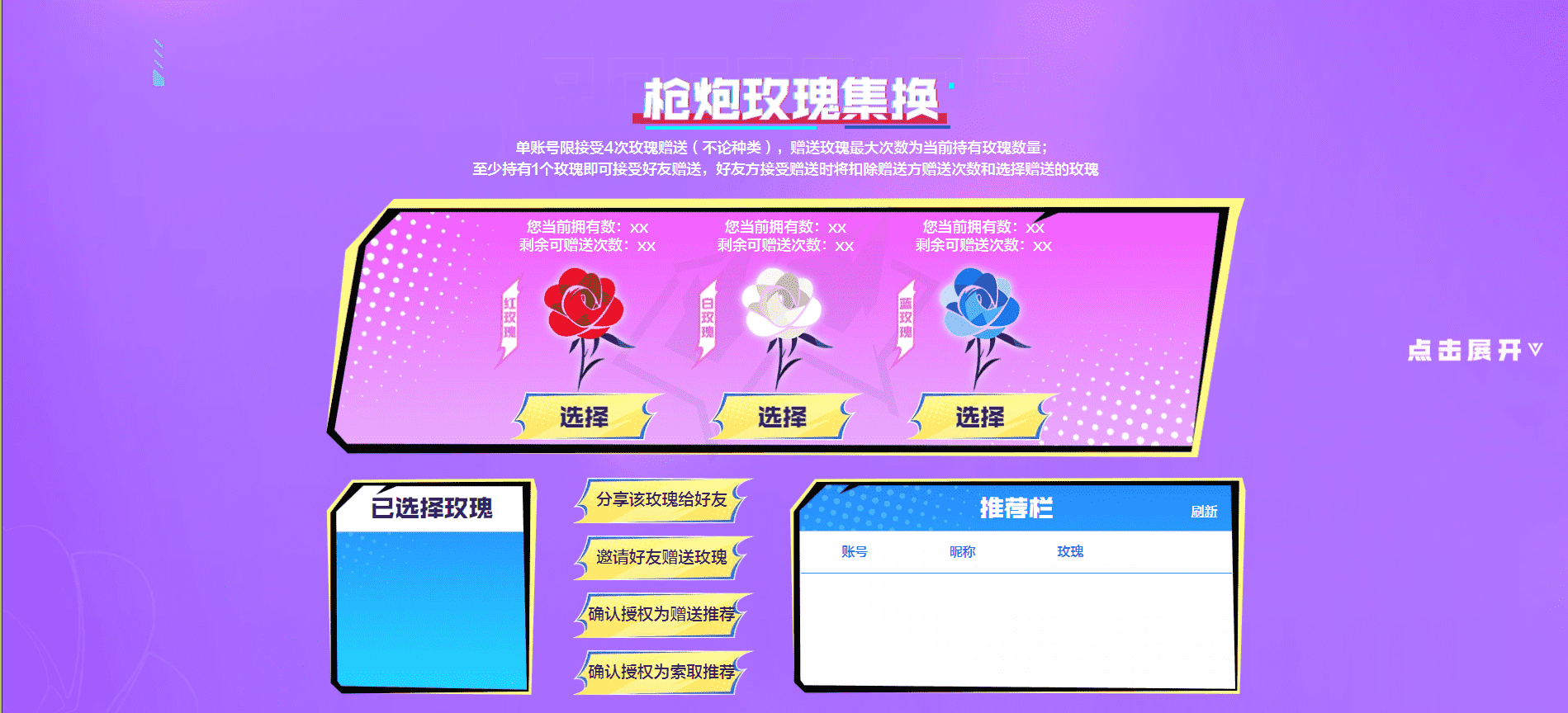 单账号限接受4次玫瑰赠送(不论种类),赠送玫瑰最大次数为当前持有玫瑰数量;