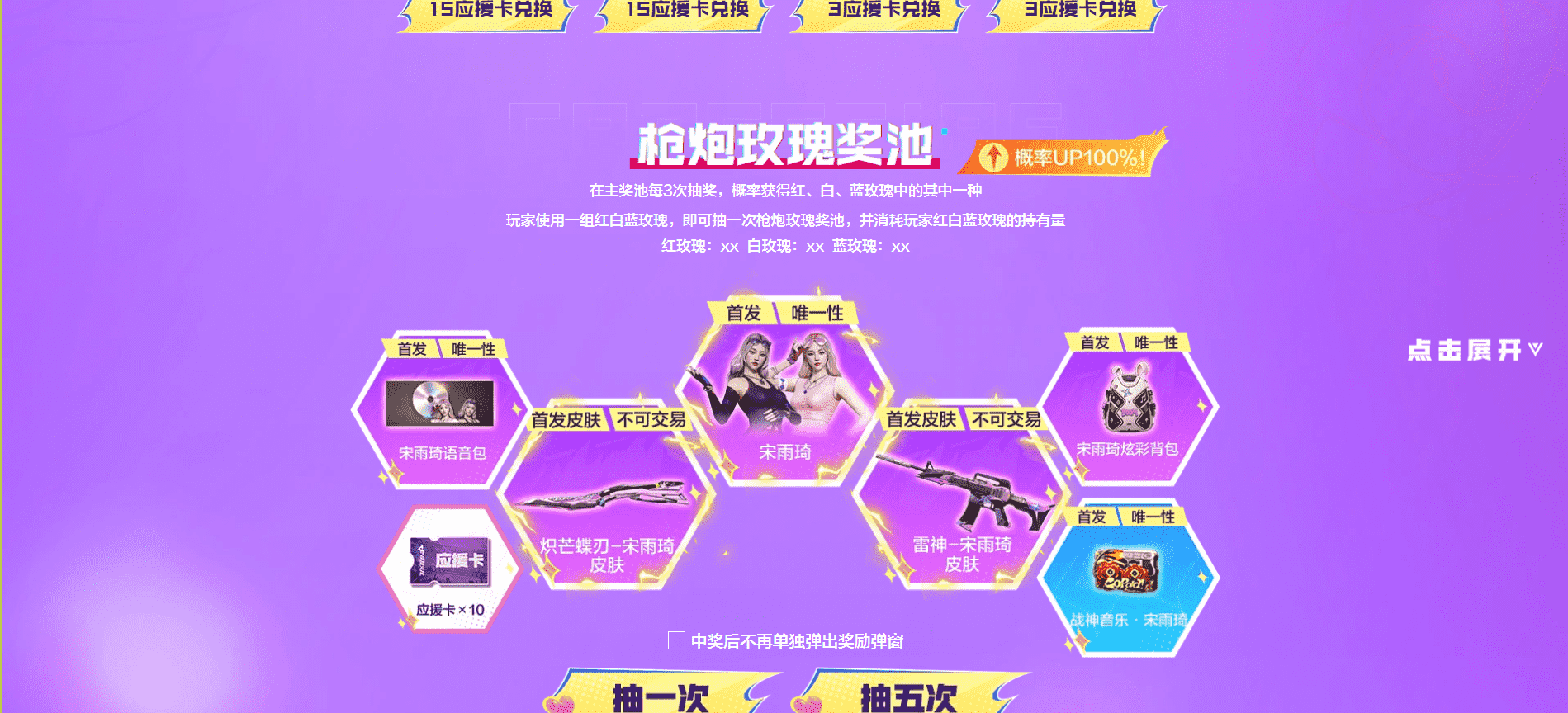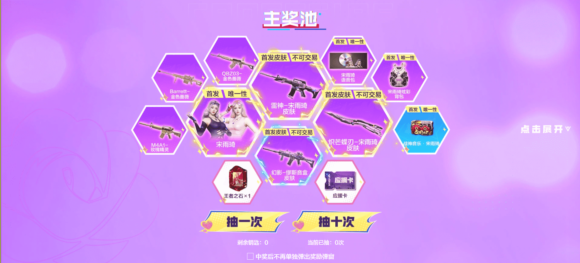 活动奖池:宋雨琦人物、雷神一宋雨琦皮肤、炽芒蝶刃-宋雨琦皮肤、幻影-缪斯音盒皮肤、宋雨琦语音包、宋雨琦炫彩背包、战神音乐·宋雨琦、0BZ03-金色蔷薇、Barrett-金色蔷薇、M4A1-玫瑰精灵、应援卡、王者之石