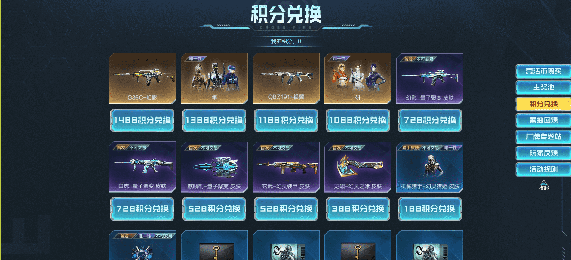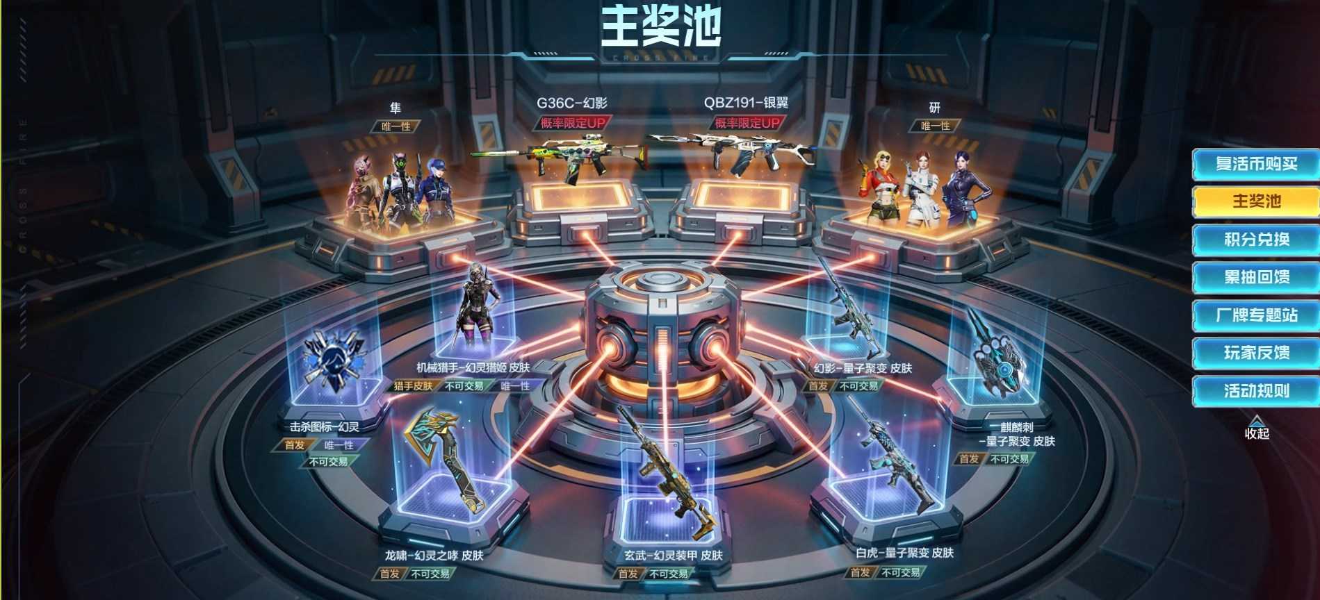 影翼共启 厂牌联动 活动奖池:G36C-幻影、隼、QBZ191-银翼、研、幻影-量子聚变 皮肤、白虎-量子聚变皮肤、麒麟刺量子聚变 皮肤、玄武-幻灵装甲 皮肤、龙啸一幻灵之哮 皮肤、机械猎手-幻灵猎姬皮肤、击杀图标一幻灵
