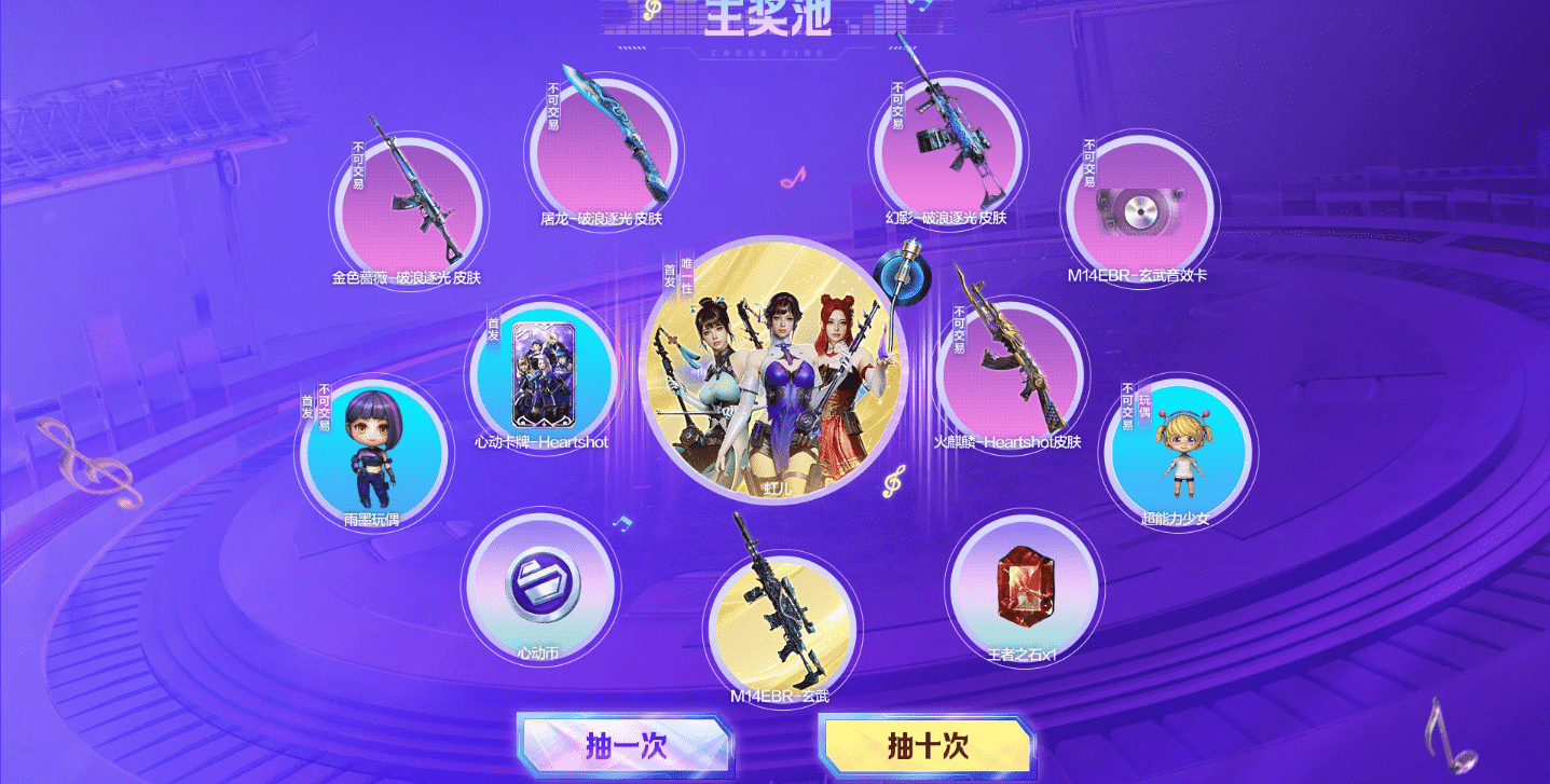 主奖池:虹儿、M14EBR-玄武、M14EBR-玄武音效卡、幻影破浪逐光皮肤、金色蔷薇一破浪逐光皮肤、火麒麟Heartshot皮肤、屠龙-破浪逐光皮肤、雨墨玩偶、心动卡牌-Heartshot、超能少女、心动币、王者之石x1