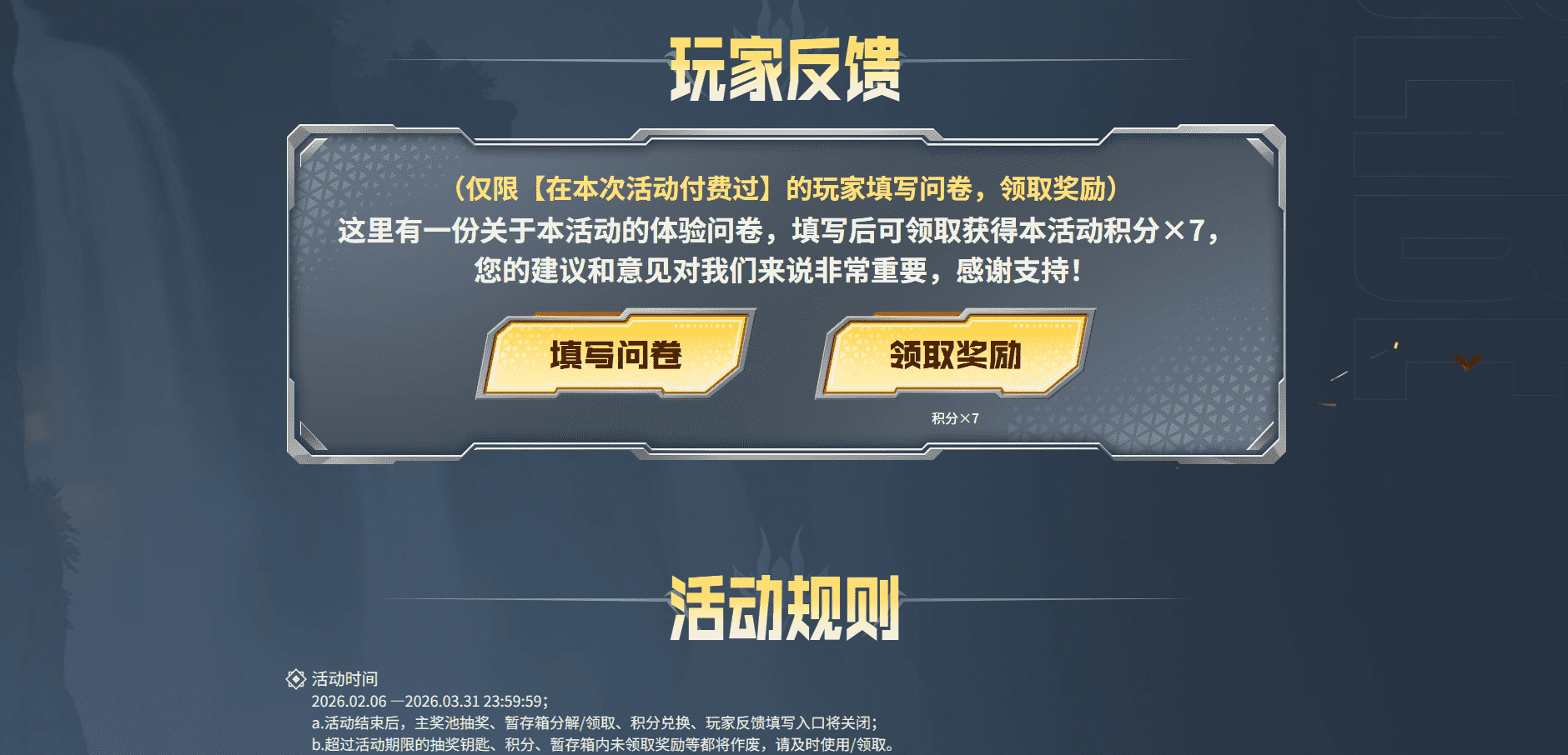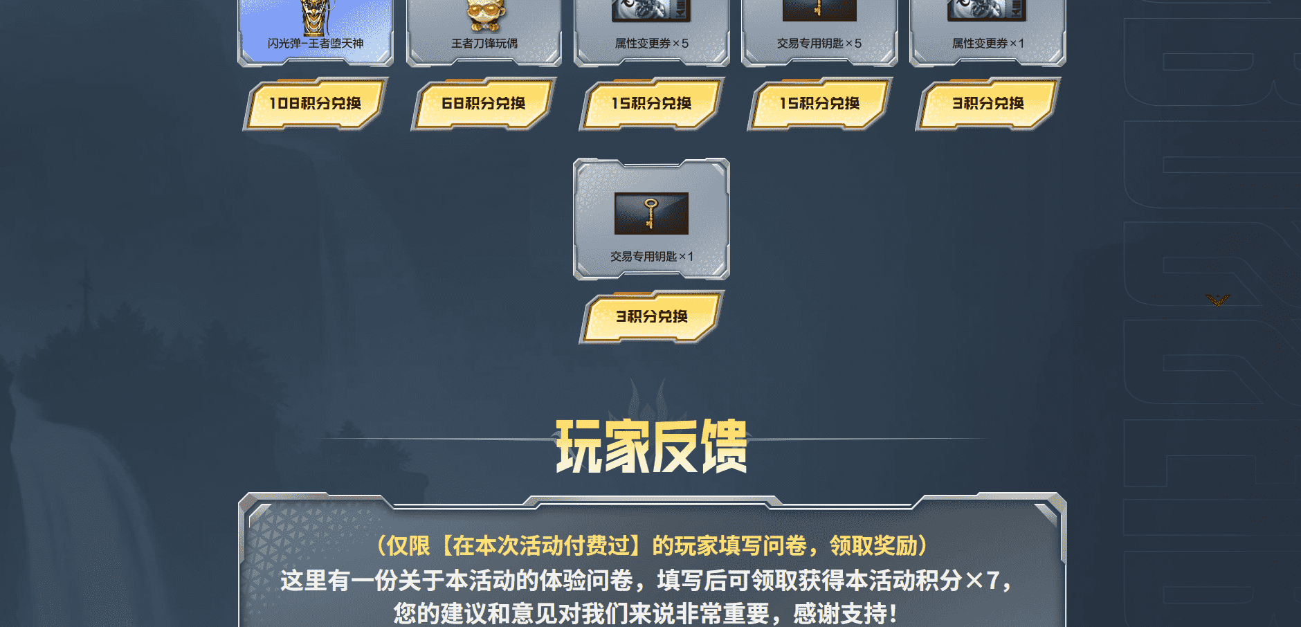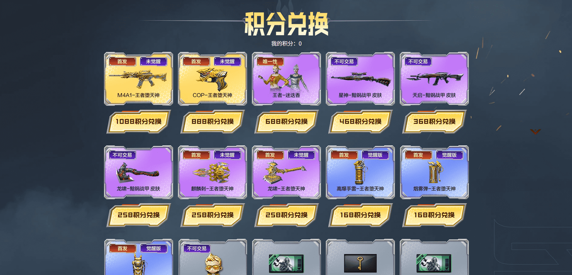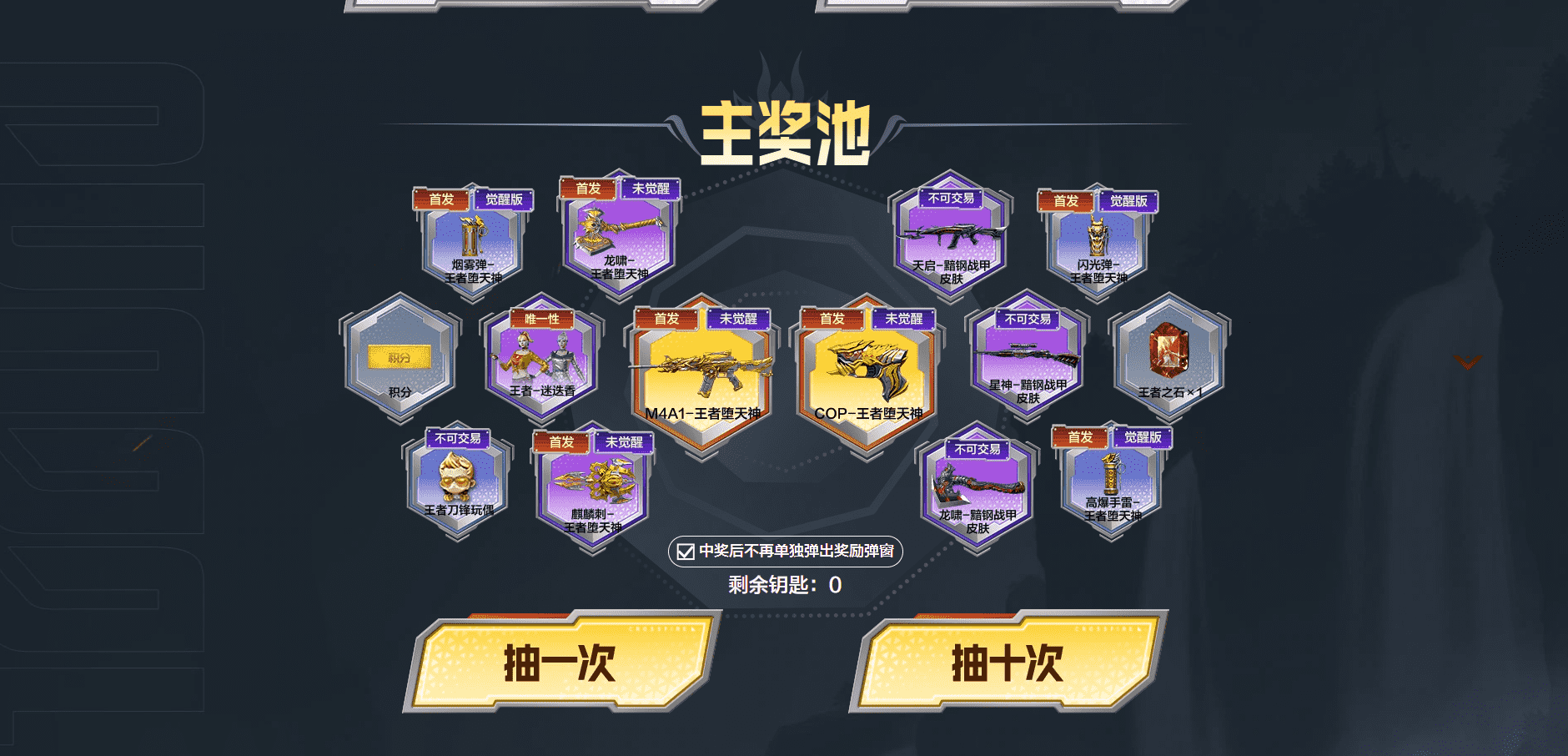 王者堕天神登场主奖池:M4A1-王者堕天神、COP-王者堕天神、王者-迷迭香、星神-黯钢战甲、天启-黯钢战甲、龙啸一黯钢战甲、麒麟刺-王者堕天神、龙啸-王者堕天神、高爆手雷-王者堕天神、烟雾弹-王者堕天神、闪光弹-王者堕天神、王者刀锋玩偶、王者之石x1、积分